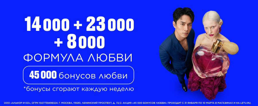 ЛЭТУАЛЬ написал формулу любви - мы решили согреть твоё сердце бонусами! У тебя на балансе 45 000 бонусов, но поторопись - каждую неделю будет сгорать по 5 000 бонусов.
