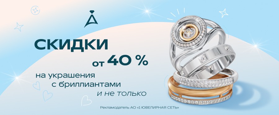 До 31.08.26 включительно при совершении покупки в розничном магазине ADAMAS Вам предоставляется дополнительная скидка от 40% на украшения с бриллиантами из выделенного ассортимента*. Скидка суммируется с бонусами программы лояльности «Карта золотых желаний». Скидка суммируется с другими акциями и промокодами.